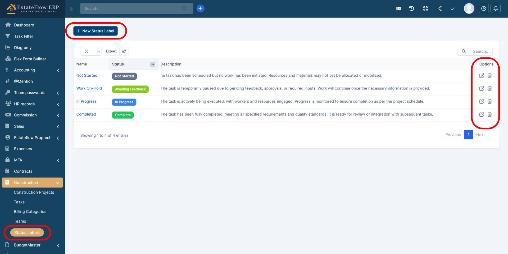 Navigate to Construction Orchestrator > Status Labels.