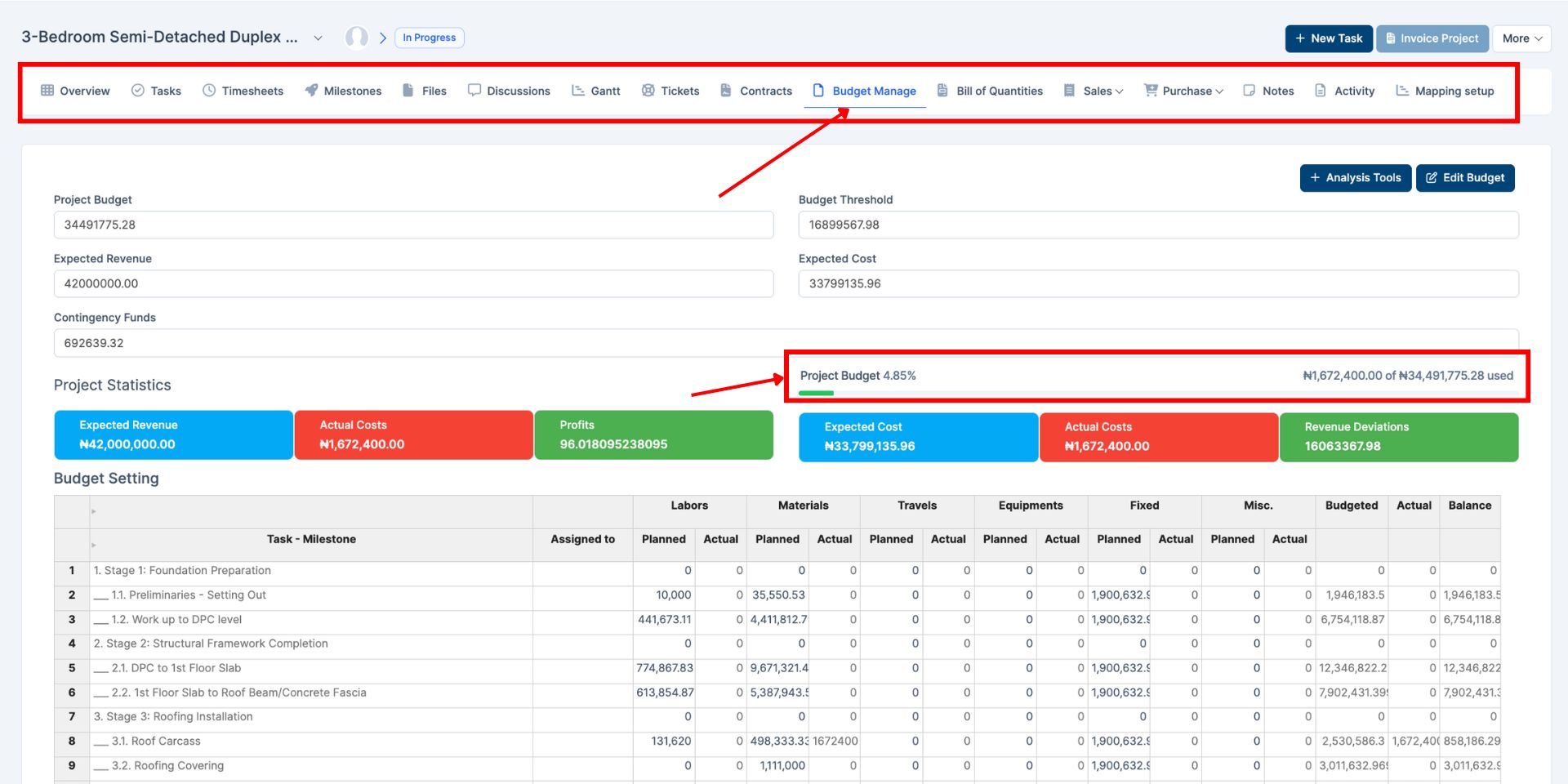Track budgets, thresholds, contingency funds, and revenues.