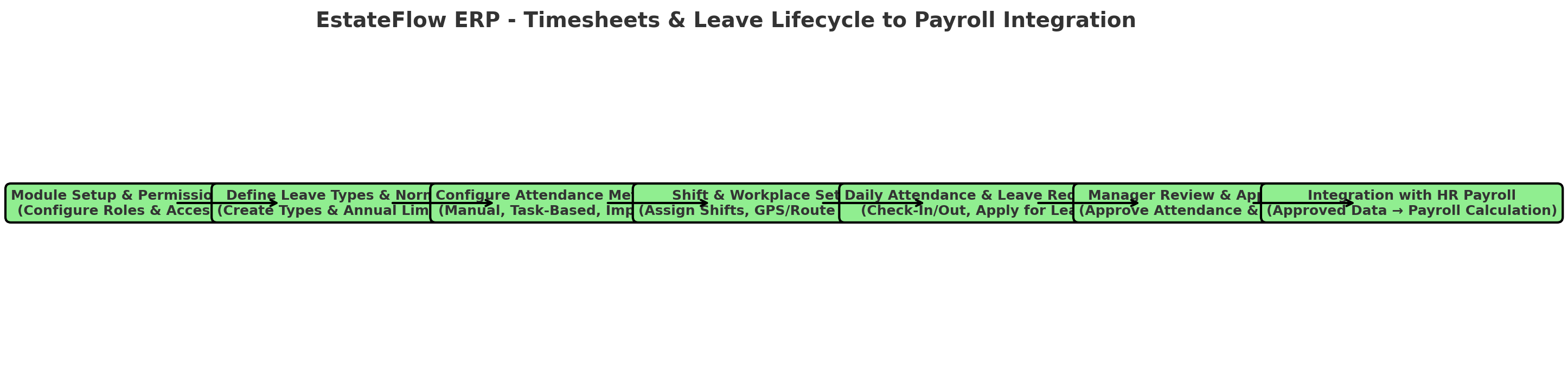 The Timesheets & Leave Management Module in EstateFlow ERP centralizes all employee attendance, time tracking, leave management, and work scheduling activities. It integrates seamlessly with: